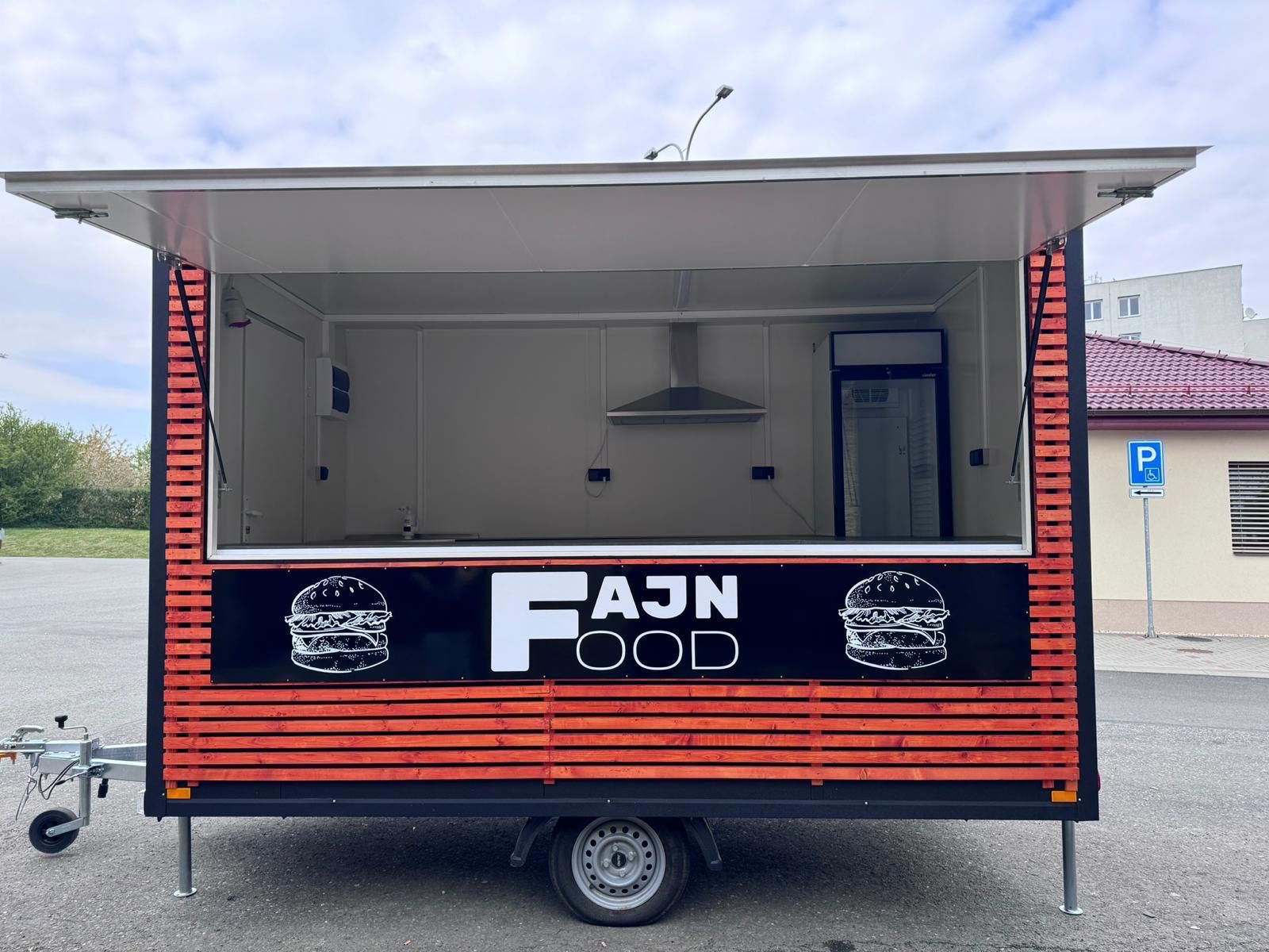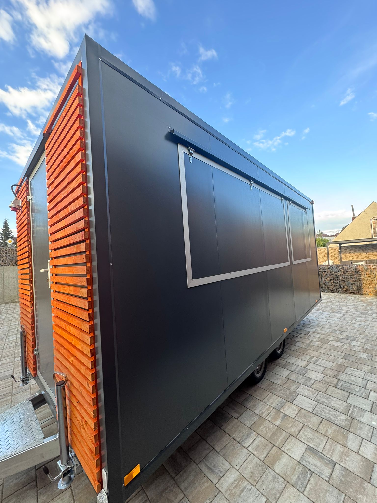 Antracitový dvounápravový gastro přívěs s kontrastním oranžovým dřevěným obkladem a dlouhým výdejním oknem; uvnitř čistý, izolovaný prostor s rozvody elektro čeká na vaše nerez spotřebiče – perfektní start pro street-food podnikání.