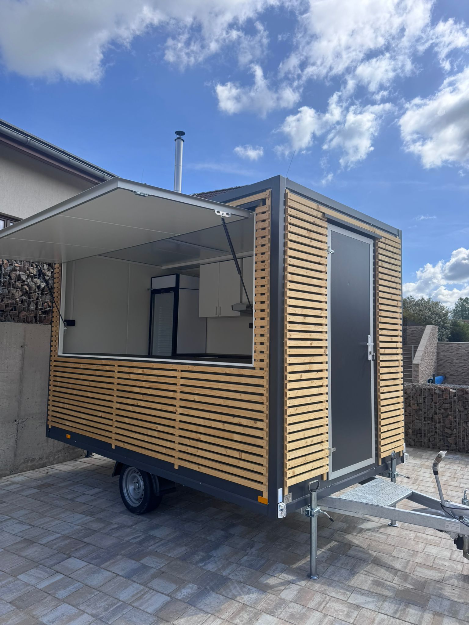 Stylový mobilní food-truck do 750 kg s lamelovým dřevem, sklopným oknem přes celou boční stěnu a plně vybavenou linkou; okamžitě připraveno na street-food, kavárnu nebo fresh bar bez nutnosti stavebních úprav.