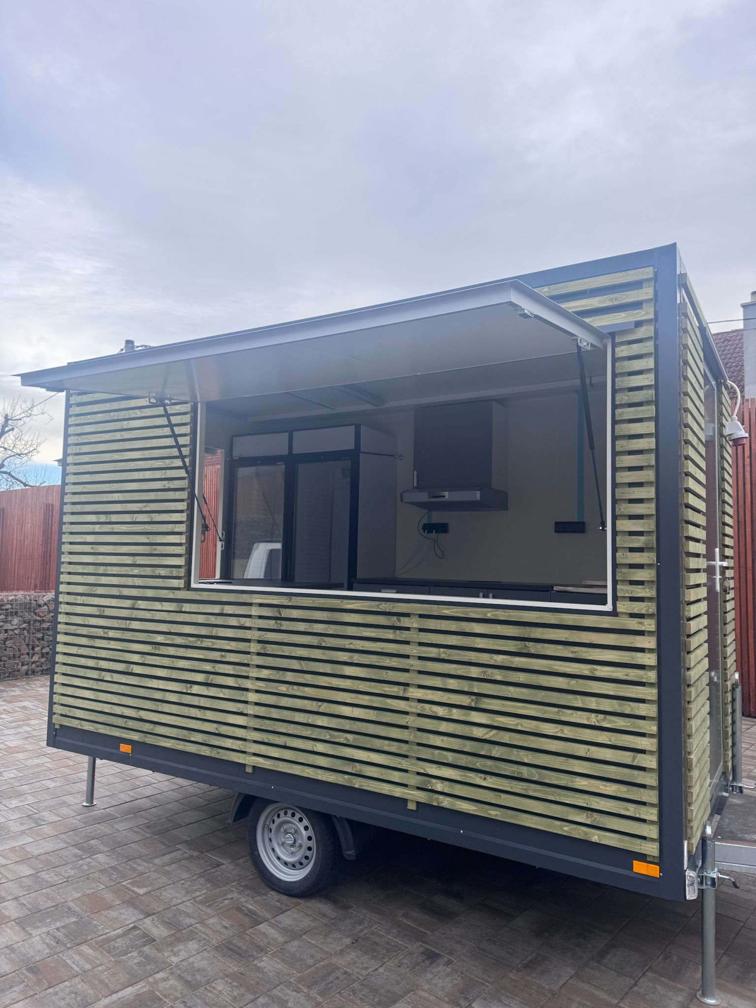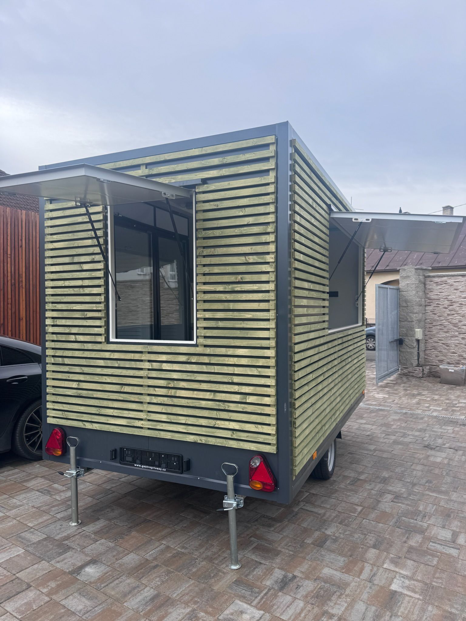 Lehký mobilní food-truck do 750 kg s přírodním dřevěným designem a rozklápěcím servisním oknem přes celou boční stěnu – zapojíte na 400 V, odjedete na farmářské trhy a podnikáte bez nutnosti rozšířeného řidičáku.