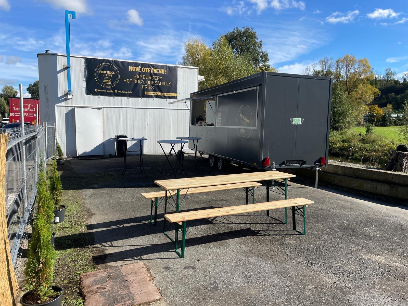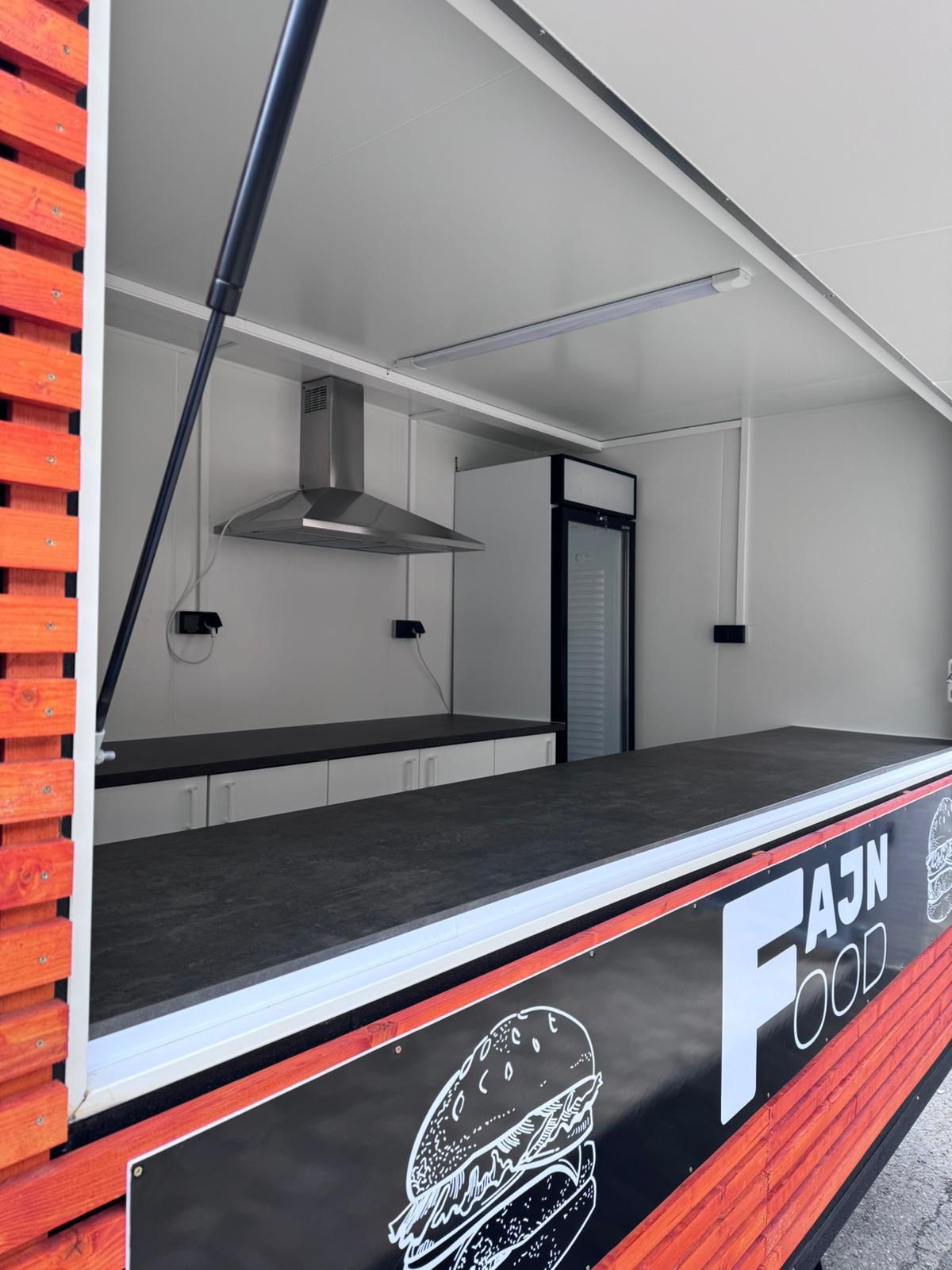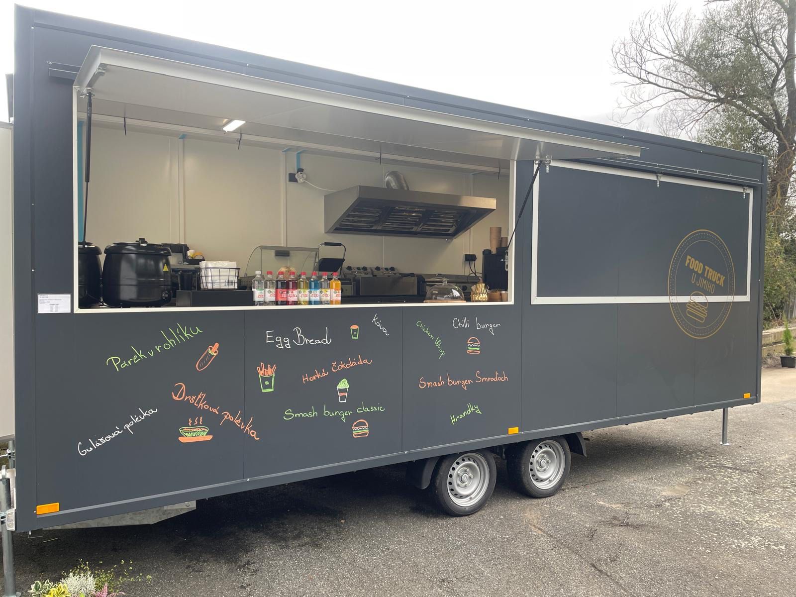 Lehký mobilní food-truck do 750 kg, čelní branding s burgerem a dlouhý barový pult; vybavený dřezem, chladicí vitrínou a masivními pracovními deskami, ideální pro street-food start-up, který chcete odjet autem bez nutnosti rozšířeného řidičáku.