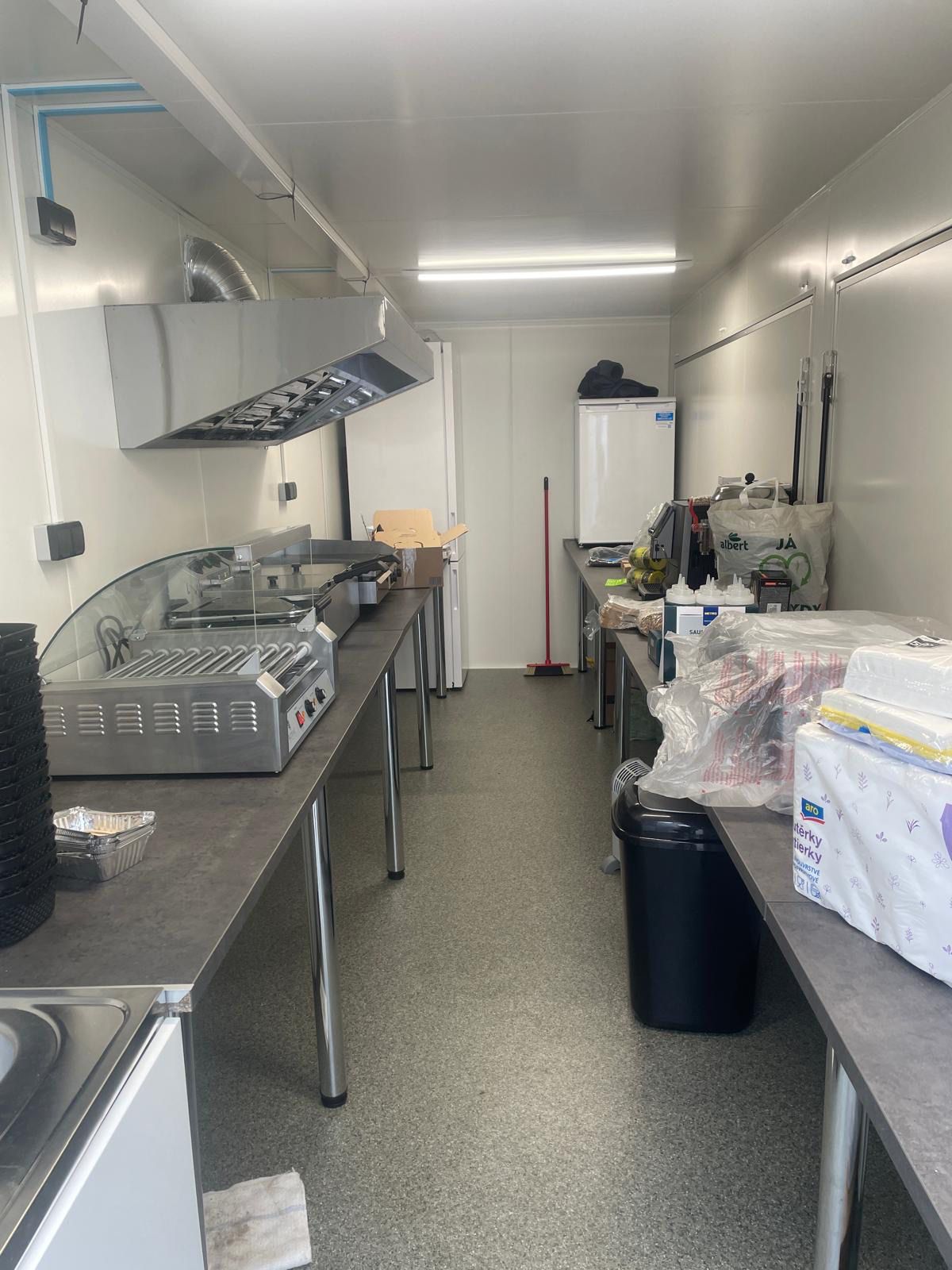 Dvounápravový gastro přívěs s extra dlouhým výdejním oknem na bocích, uvnitř profi kuchyně s grilem, digestoří a chladicí vitrínou – hotový food-truck pro burgery, hot dogy i polévky na festivalech a firemních akcích.
