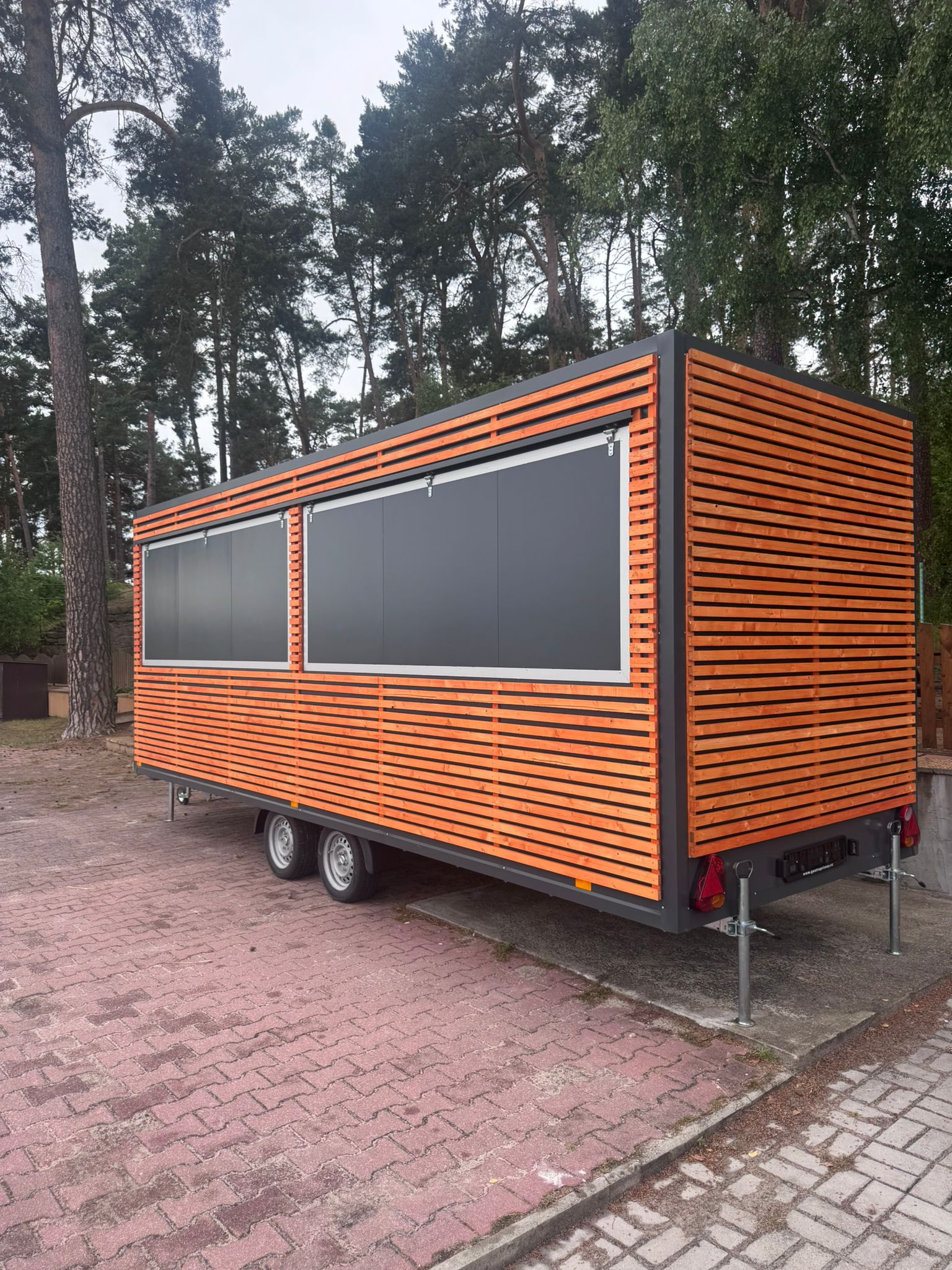 Dvounápravový gastro přívěs s celoplošnou fasádou z opalovaných dřevěných latí a extra širokým výdejním oknem – stylová mobilní kuchyně, která zaujme na farmářských trzích i městských festivalech.
