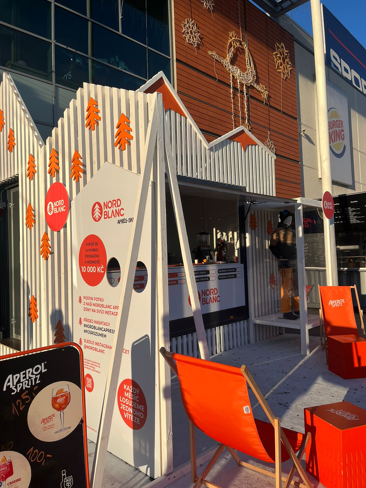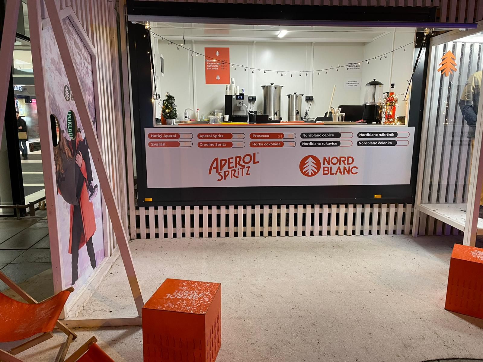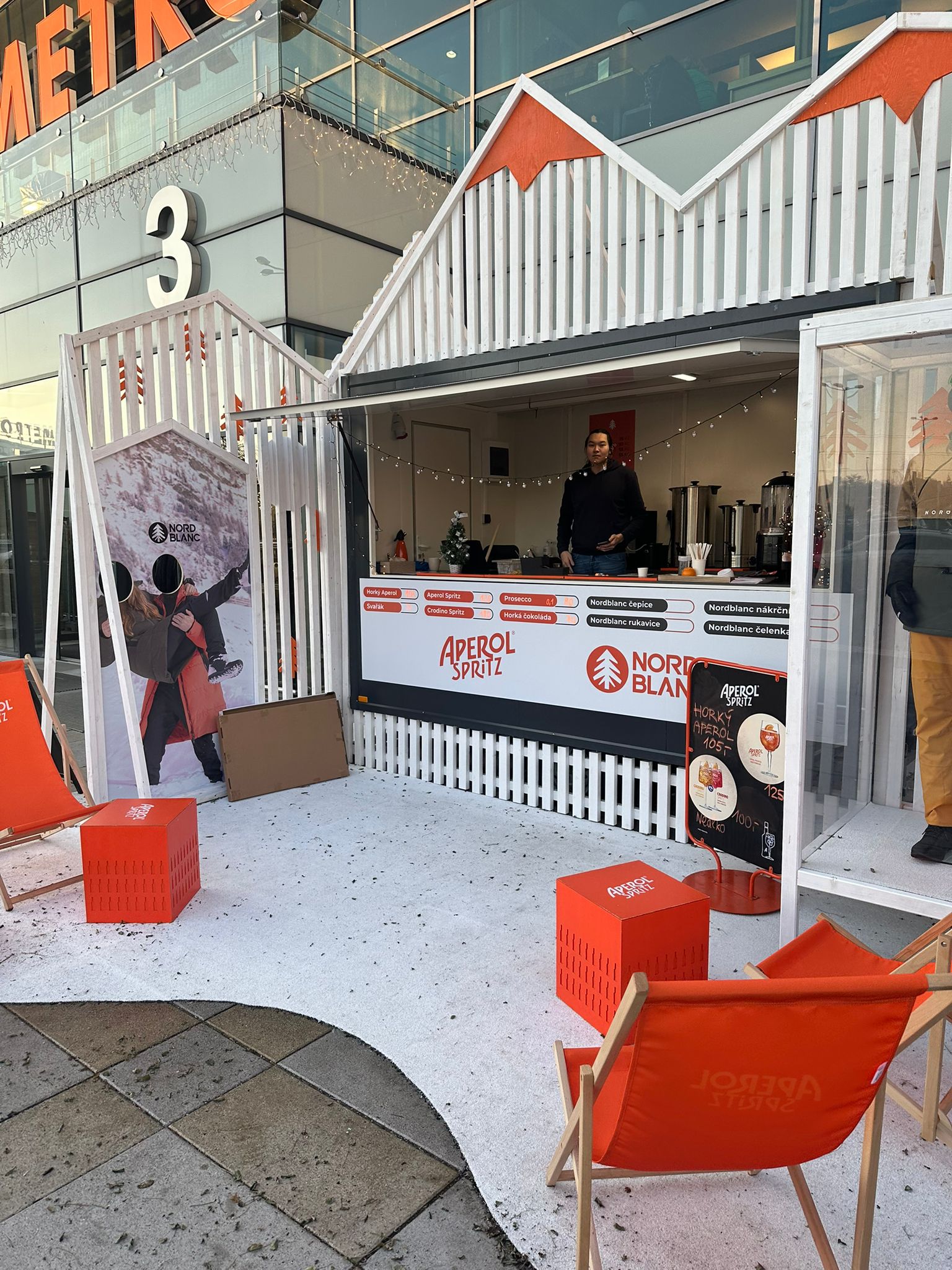 Brandovaný mobilní promo stánek ve stylu horské chaty s velkým výdejním oknem, dekorativními štíty a dřevěným plotem – ideální pop-up bar pro zimní event marketing, svařák i horký Aperol před nákupním centrem.